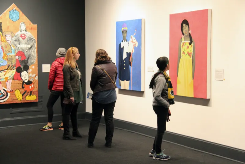 NMWA visitors study Amy Sherald’s It Made Sense…Mostly In Her Mind, 2011 (left) and They call me Redbone but I’d rather be Strawberry Shortcake, 2009 (right); Photo: Emily Haight, NMWA