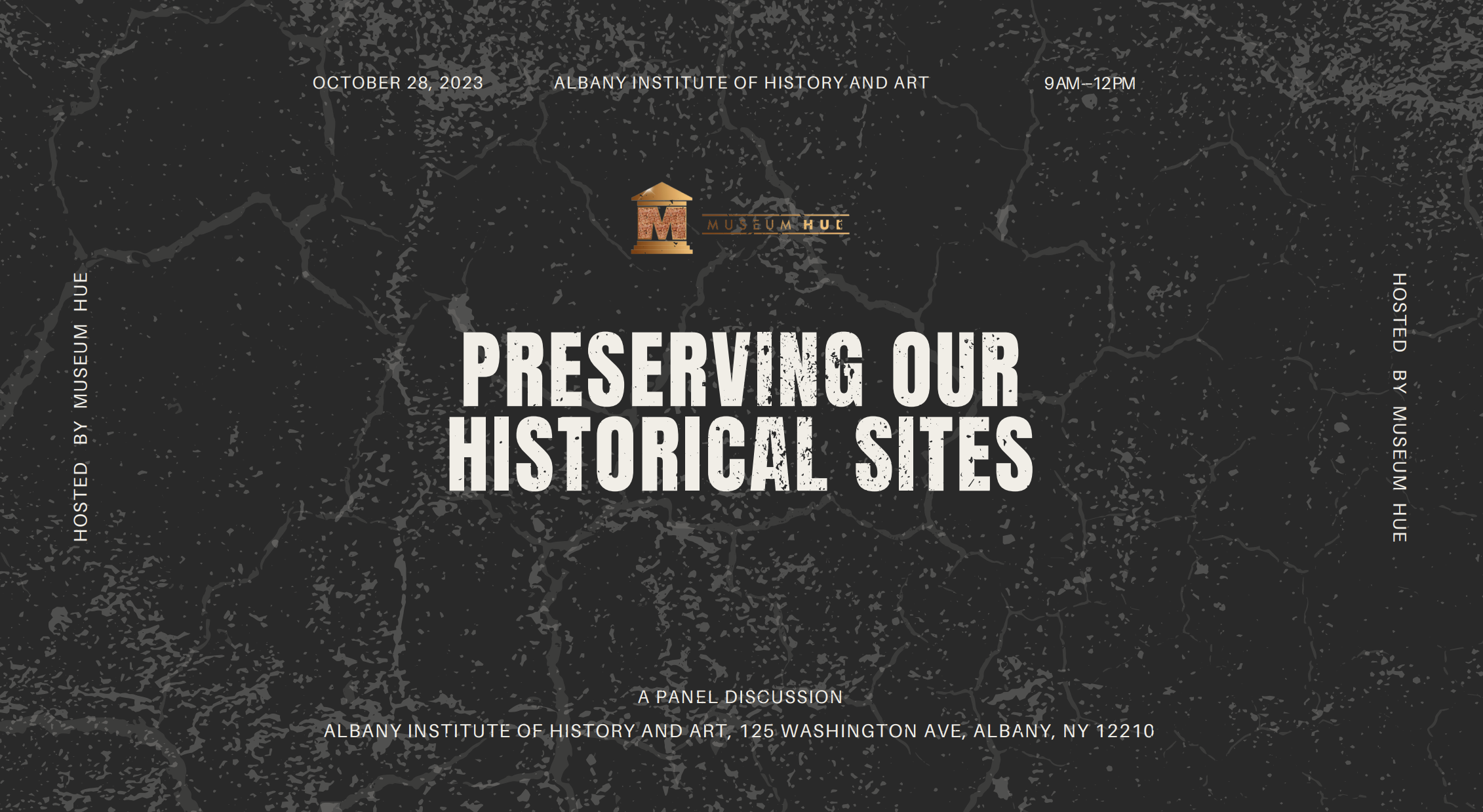 Join Museum Hue on Saturday, October 28th, 2023 at the Albany Institute for Preserving Our Historical Sites panel discussion. There will be a light breakfast hour from 9:00am – 10:00am, and a panel discussion from 10:00am – 12:00pm.