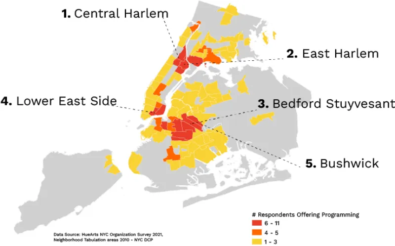 - Better understand the breadth and scope of POC-serving arts entities by researching and mapping their presence across NYC’s five boroughs.